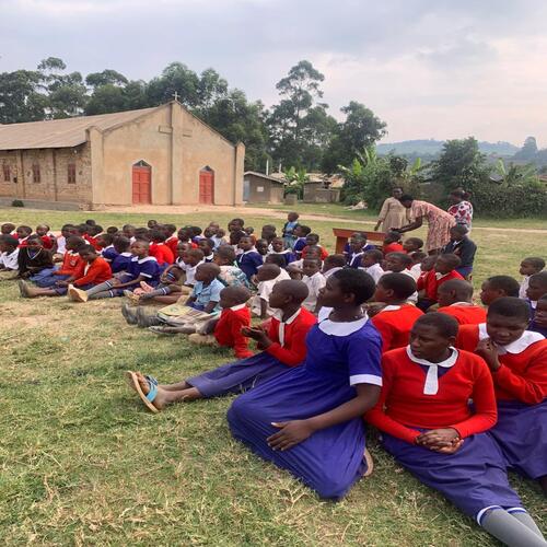 Queen Melissa planting trees with children from Bushuro Primary School in Kabale district